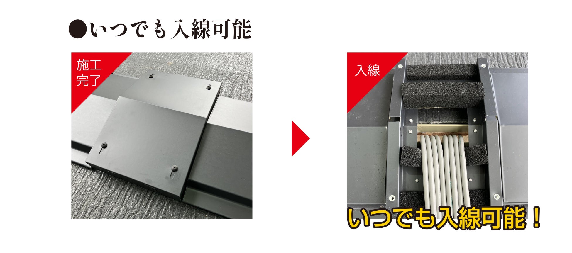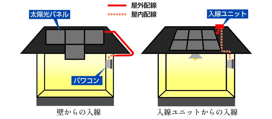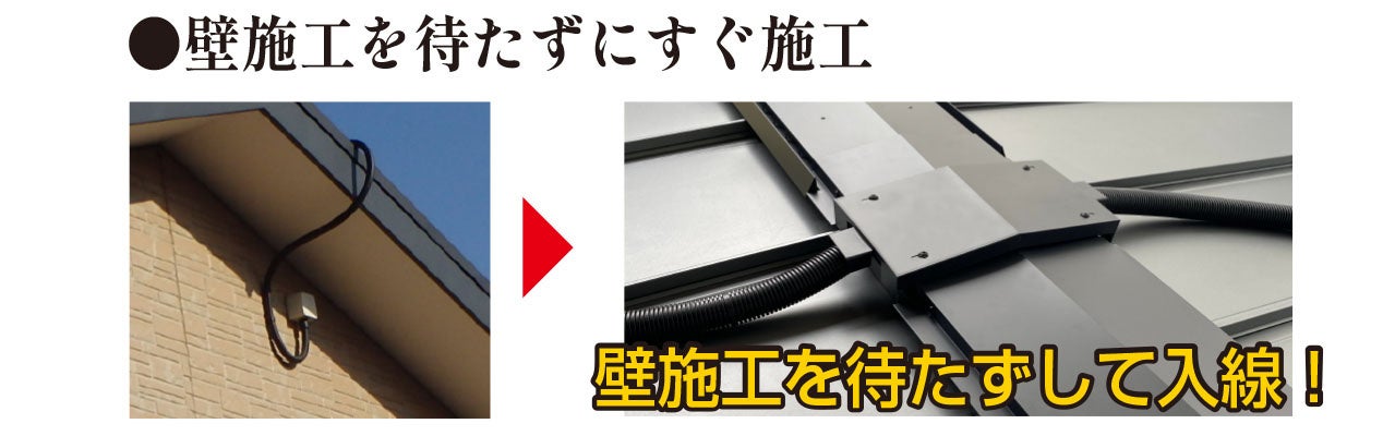 通常、屋根施工後の太陽光パネル設置においては両社の施工タイミングを調整する必要がありましたが、「入線ユニット」なら屋根施工時に設置が完了。専門的な施工手間はなくパネル設置業者様のみでいつでも簡単に入線が可能となります。また、外壁からの配線工事の場合は、壁施工を終えてからの工事が必要でしたが、「入線ユニット」は壁の施工を待たず、屋根施工後すぐに入線することができるため、施工スケジュールの短縮や足場コストの削減にもつながります。