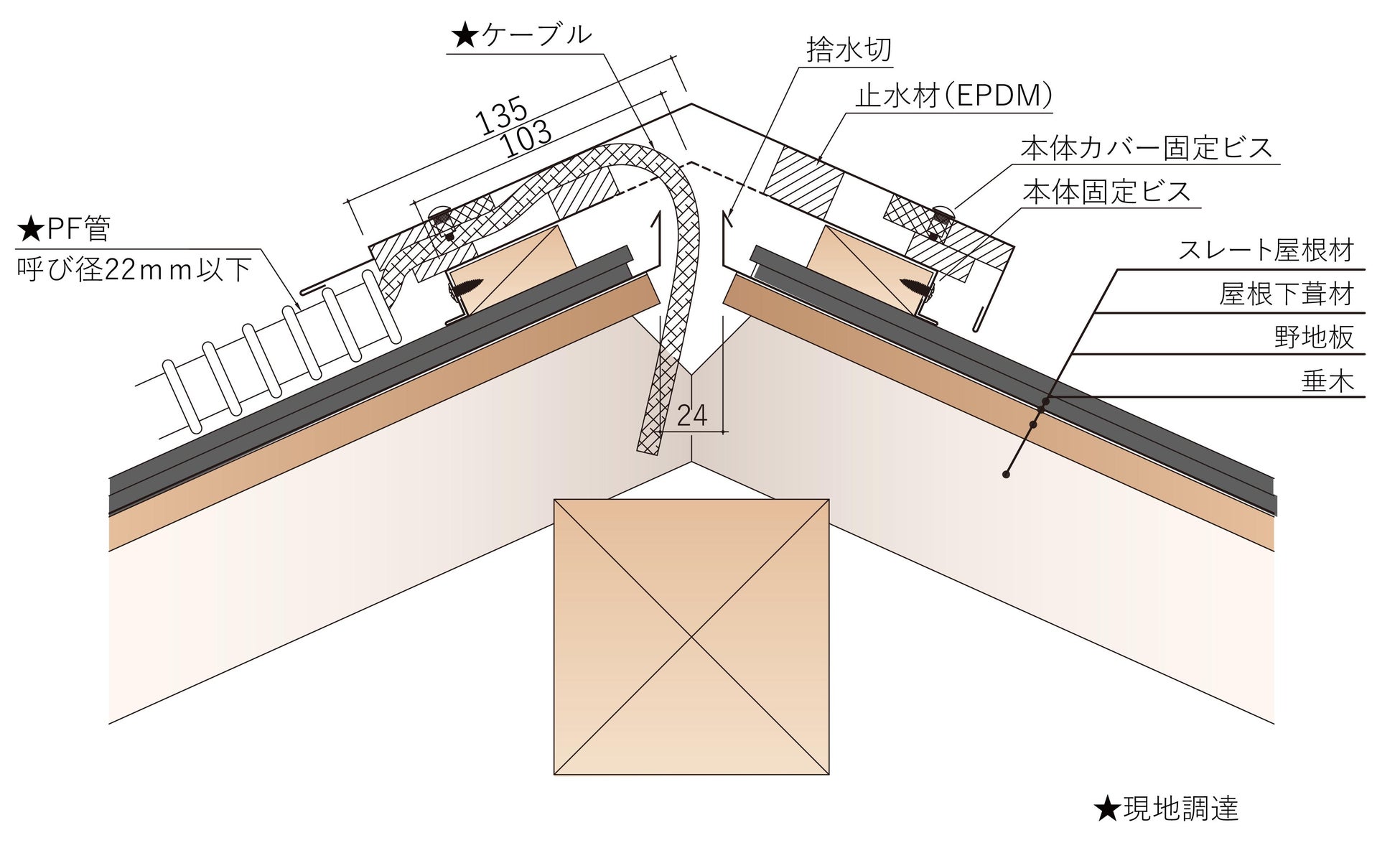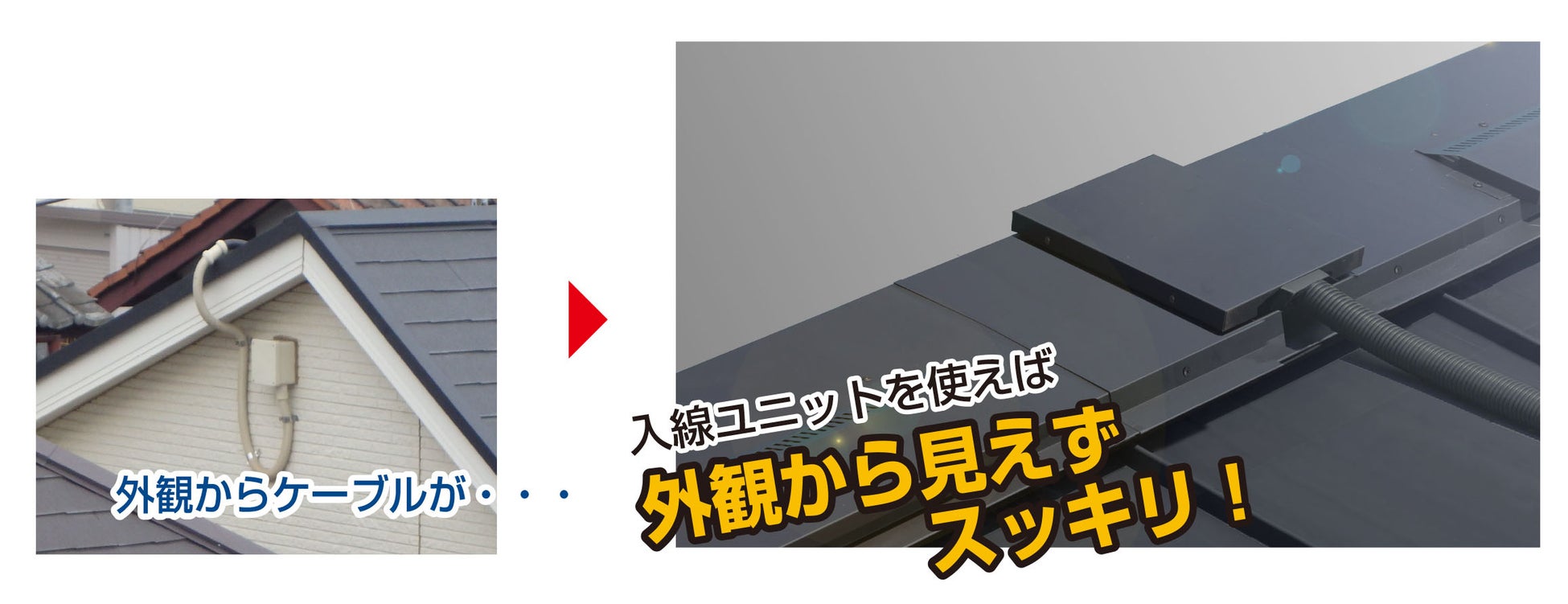 従来施工だと壁から入線させる事が多いので、ケーブルが住宅の外観から見え美観を損なうこともあります。「入線ユニット」を使用すれば棟部から小屋裏に入線するので壁側にケーブルが出てこず、美観を損なう事がありません。また PV ケーブルだけでなく、テレビのアンテナ線や BS・CS のアンテナ線等も引き込めます。