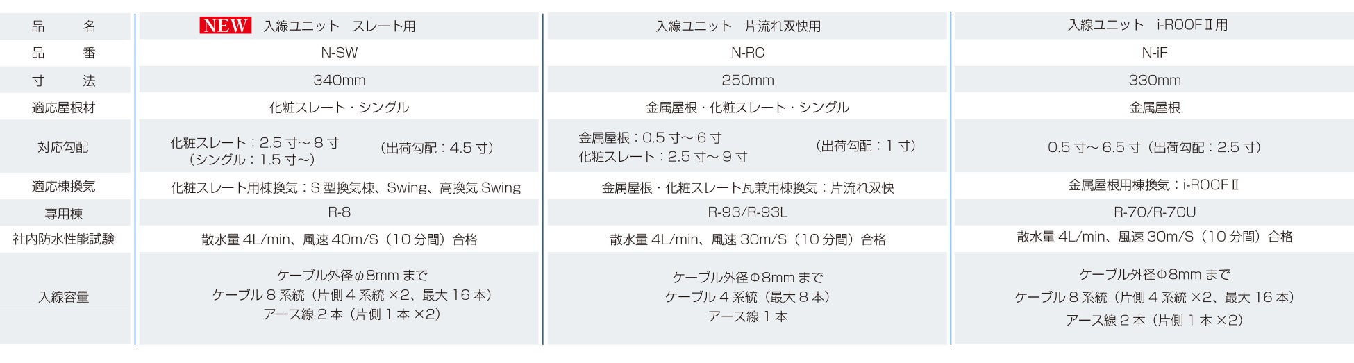 【入線ユニット仕様一覧】
