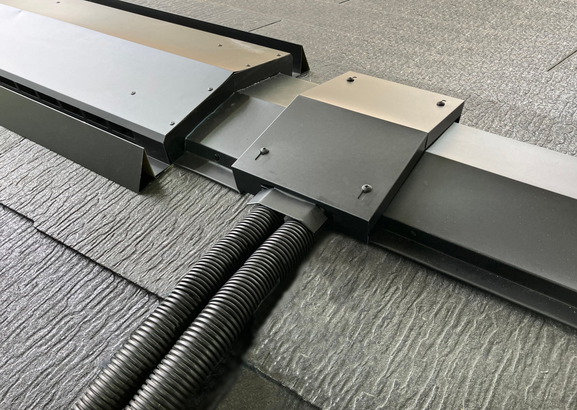 政府や行政の方針に伴って市場のニーズにも動きがあり、弊社棟換気を導入されているお客様より、化粧スレート瓦用の「入線ユニット」のご要望をいただき、「入線ユニット」シリーズに新たなラインアップを加える事になりました。今回のシリーズにスレート用が加わる事により、片流れ、切妻や寄棟の金属屋根、スレート瓦、シングル材に対応した棟換気に適合し、多種多様な屋根で活躍できます。ぜひ棟換気とご一緒にご使用ください。