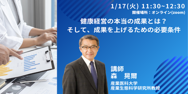 そこで本セミナーでは、産業医科大学の森 晃爾 先生をお招きして、経営戦略としての健康施策について学術領域の立場からお話しいただき、人事・健康管理・経営部門の皆さまが自社にて実践いただけるナレッジを提供いたします。