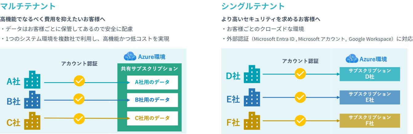 「マルチテナント」「シングルテナント」いずれのプランにおいても、データは分離されて保管されています。他の企業のデータが混在することはなく、安心してご利用いただけるセキュリティ環境を実現しています。
