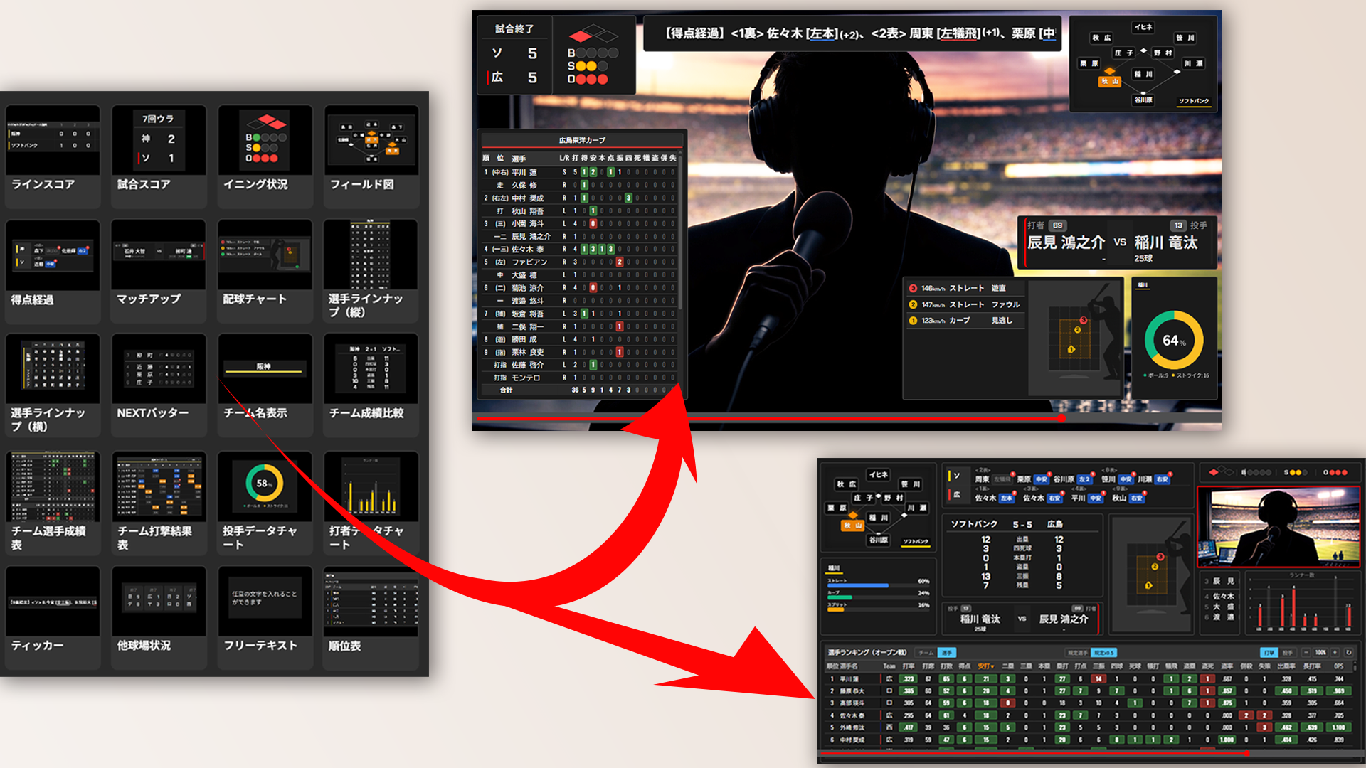 スコアや詳細スタッツをリアルタイムで自動表示し、手軽なデータ演出を実現