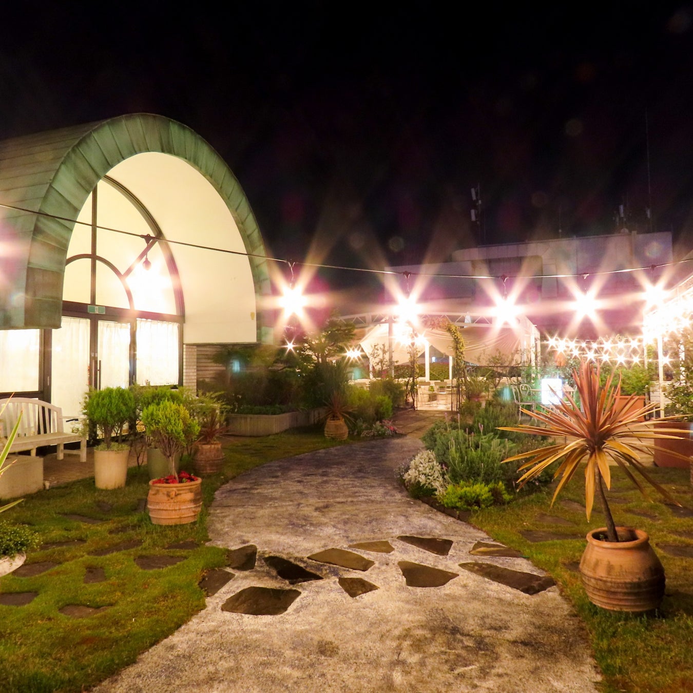 夜にはミラーボールが輝き、グリーンに囲まれたリラックスした雰囲気の中で特別な時間をお過ごしください。