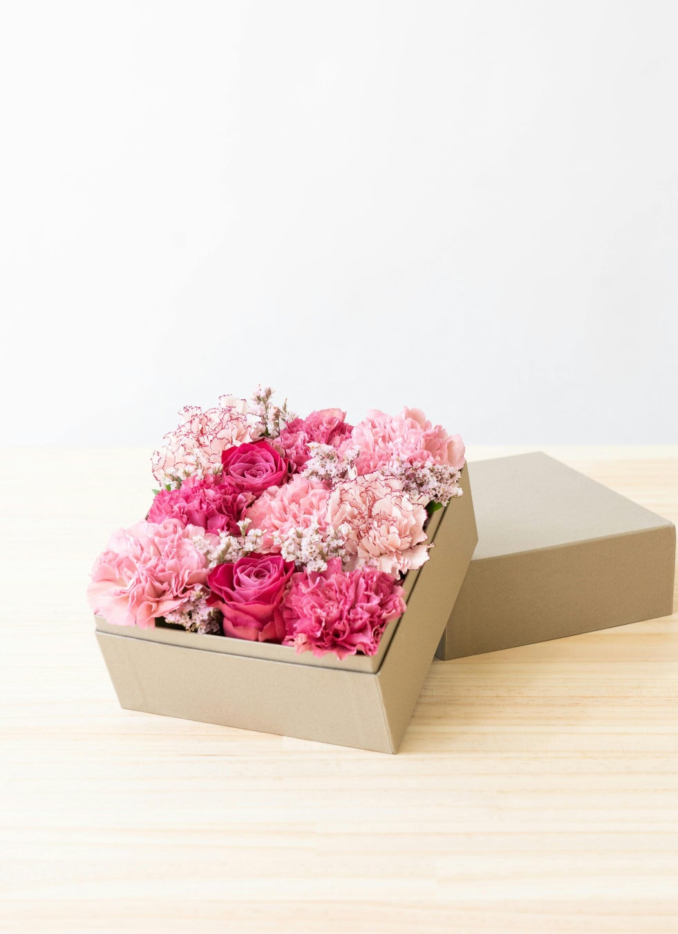 淡いピンクとベージュがかった2タイプのピンクのカーネーションを合わせたデザインです。