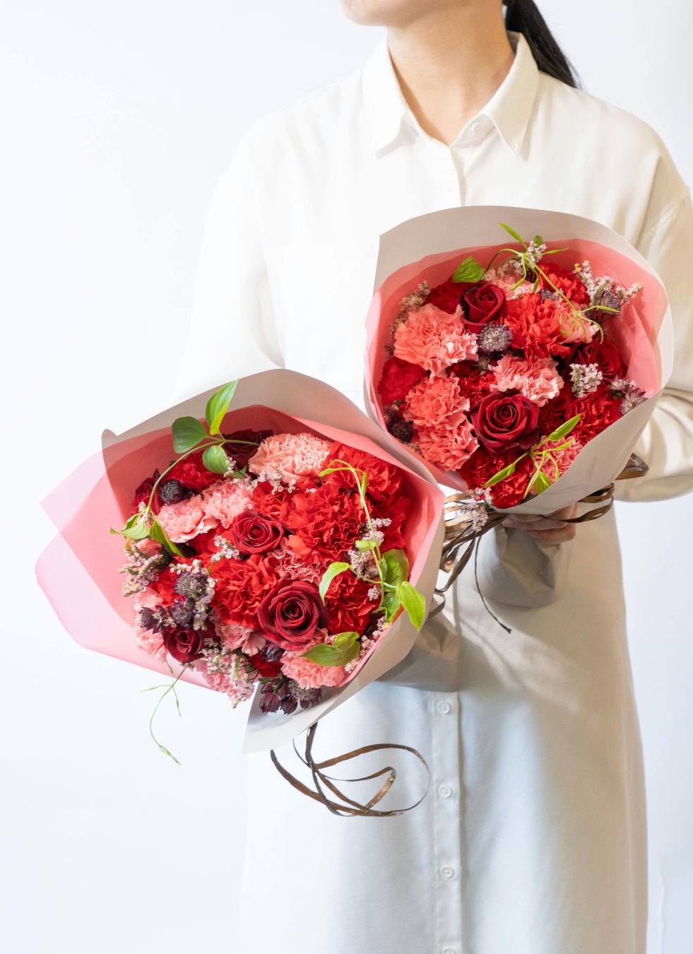王道の真っ赤なカーネーションがメインです。ピンクのカーネーションも合わせることで、優しい明るさを出しています。