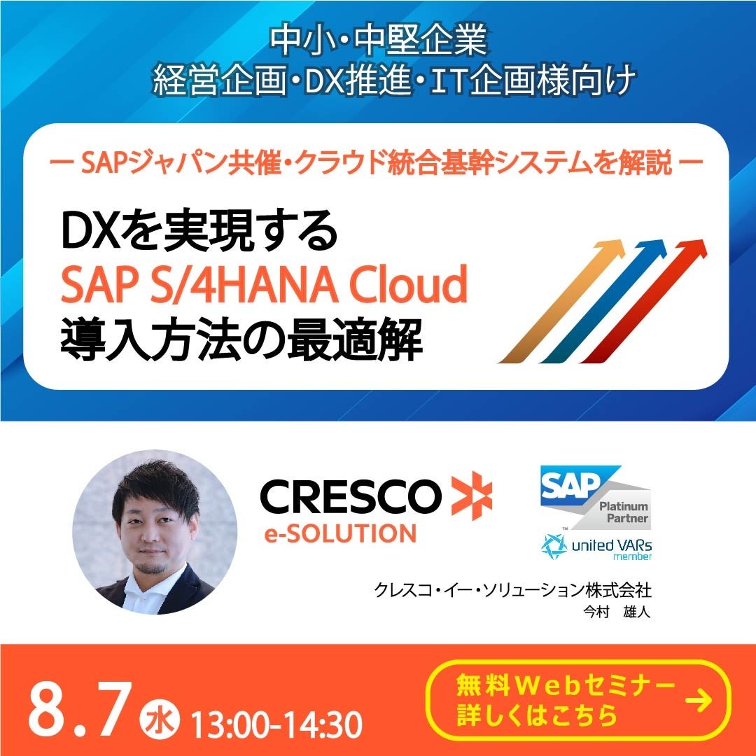 クレスコ・イー・ソリューション株式会社(本社:東京都千代田区、代表取締役社長:後藤 聡)は、SAPジャパン共催・SAP S/4HANA Cloud導入Webセミナー「DXを実現する SAP S/4HANA Cloud 導入方法の最適解 ~ ソリューションの特色と、構想策定よりも前にやっておくべきこと ~」を、2024年8月7日(水)13時~14時30分に開催いたします。