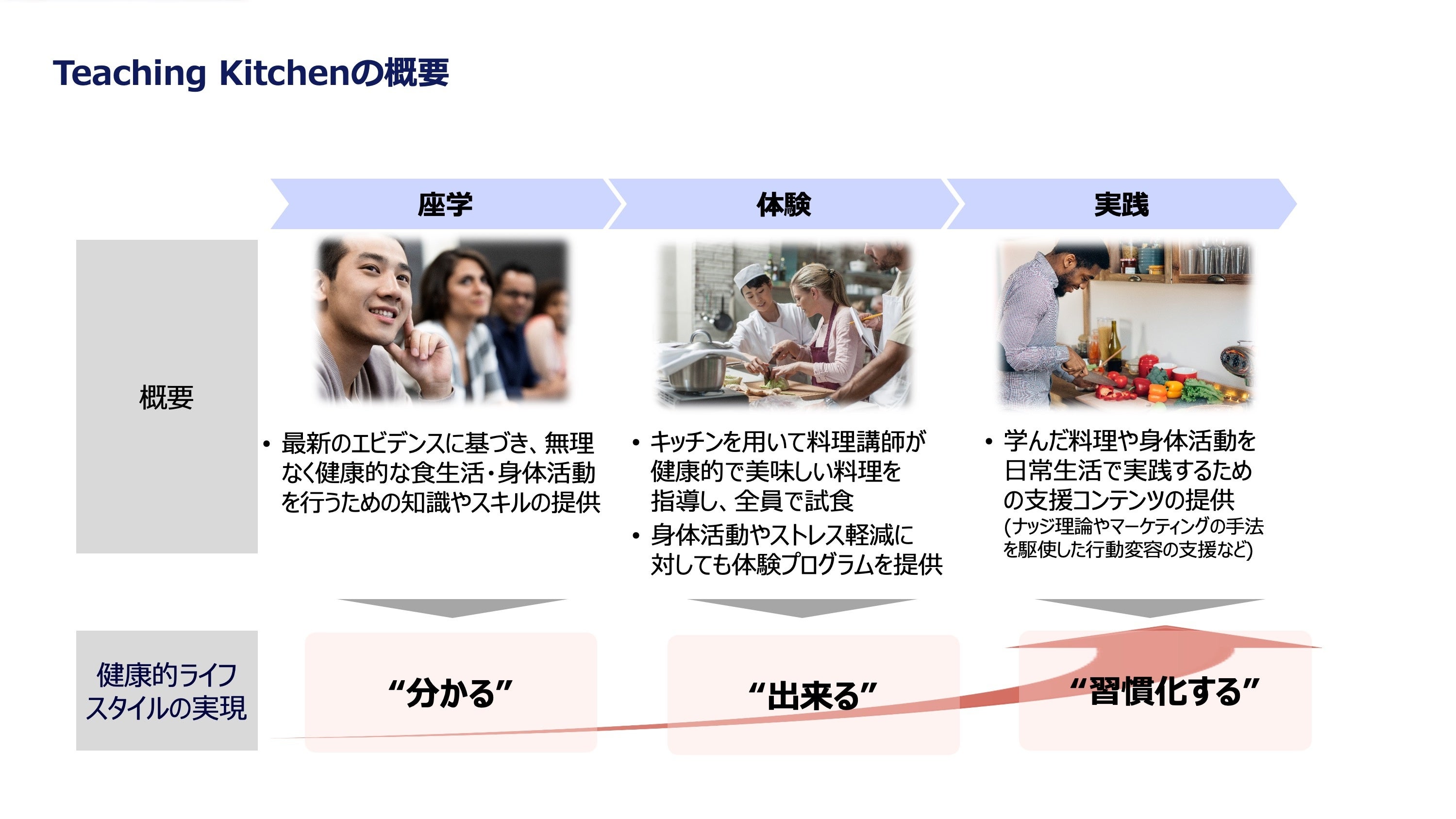 同プログラムのベースとなるのは、ハーバード大学T.H.チャン公衆衛生大学院で料理栄養講座のディレクターを務める医師、デビッド・アイゼンバーグ准教授が主宰する研究グループ、Teaching Kitchen Collaborative(以下、TKC)が米国で開発を行っている肥満・糖尿病治療プログラムです。当社は、2021年6月にTKCと共同研究契約を締結し、同プログラムの日本向けカスタマイズとその有効性評価のための研究を行う独占的な権利を取得しました。