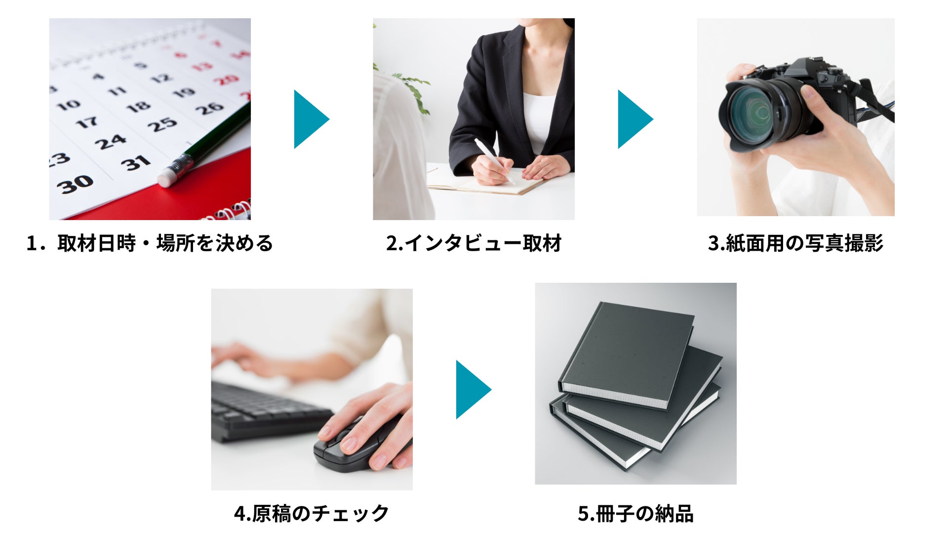 冊子の納品(取材から約2か月後) 取材日から約2ヶ月の製作期間をいただいたうえ、書籍部を郵送にて納品いたします。