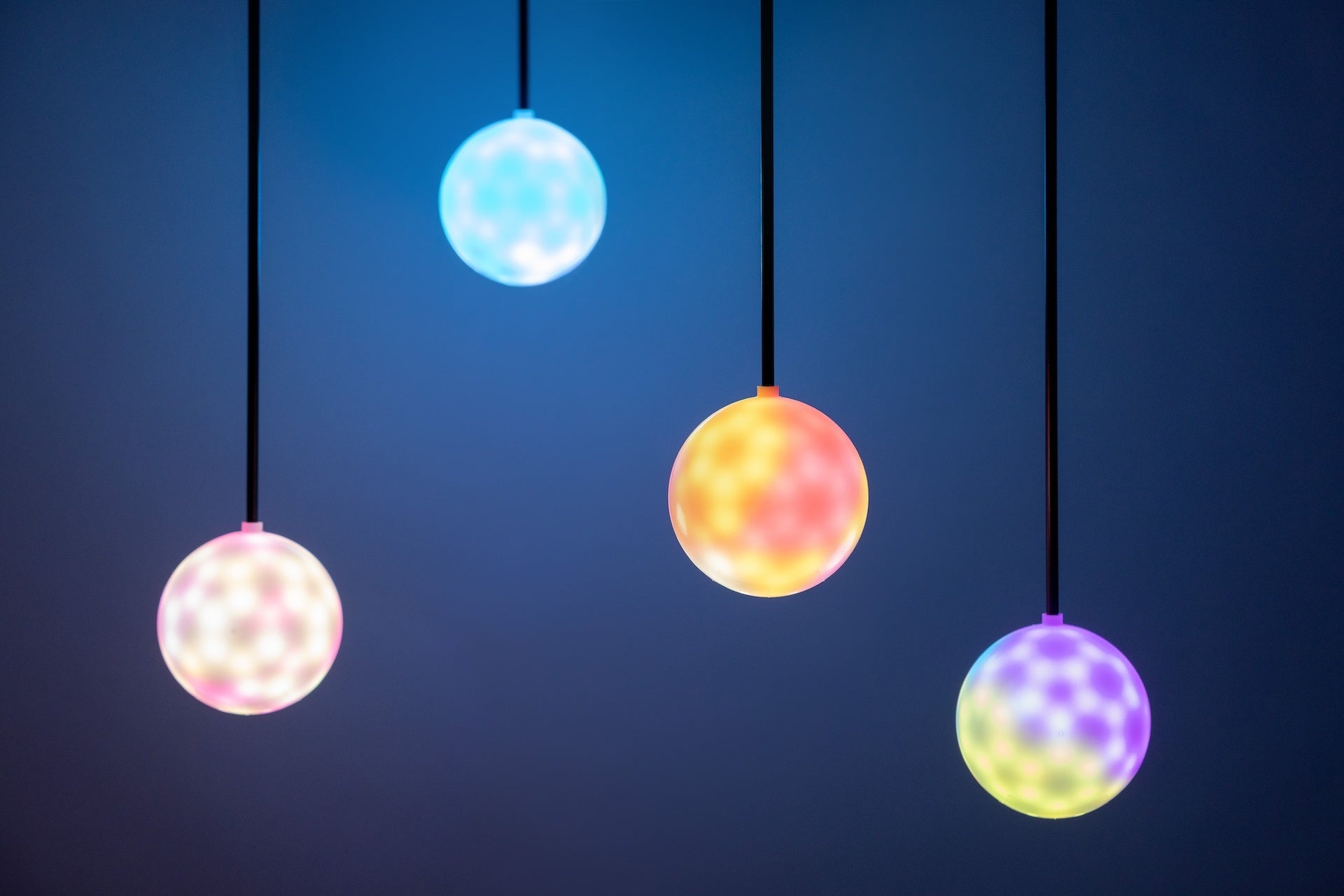 メディアアート作品や空間演出、家庭向けに様々な照明を開発してきたアブストラクトエンジンが今回開発した「PixOrb」の特徴は、単体で三次元的なアニメーションを表現可能なミニマムな灯体であることです。これまで様々なシーンで空間的な照明演出を行う際、各灯具はLEDを直列に連ねた「曲線」や、小型ディスプレイに近い「平面」の光を構成要素としていることがほとんどでした。それら各灯具の位置を考慮することで「二次元的な灯具の三次元的な配置」を考慮した演出を行ってきましたが、「PixOrb」では「三次元的な灯具の三次元的な配置」を活かした演出を新しい形で実現することを目指しました。そのために、より多面的でありつつミニマムな三次元形状である「球」に着目して開発を始めました。