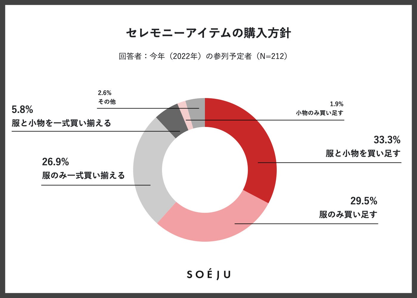 セレモニーアイテムの購入方針についての質問の回答では「服のみ買い足す」「小物のみ買い足す」「服と小物のみ買い足す」の回答合計値は63.7%を占め、「服と小物を一式買い揃える」「服のみ買い揃える」の回答合計値は32.7%に。「買い足し派」は「一式揃える派」の約2倍に上りました。