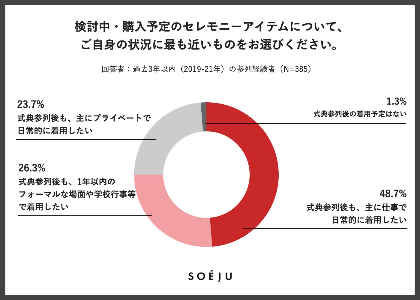 モデラート株式会社(本社:東京都 渋谷区、代表取締役:市原 明日香 、以下 モデラート)が展開するD2Cブランド「SOÉJU(ソージュ)」は、2022年1月、「子どもの卒業式・入学式の式典参列時の母親の服装」に関する調査を実施いたしました。調査結果からは「子ども、親ともに参列できる形で式典を開催してほしい」という回答が約9割を占めました。また式典参列時の母親の服装(セレモニースタイル)については、「無難さ」よりも「自分らしさ」を重視する傾向が見られ、一式新調する「専用買い」よりもその後の日常的な着用を前提とした「買い足し」傾向が見られた。