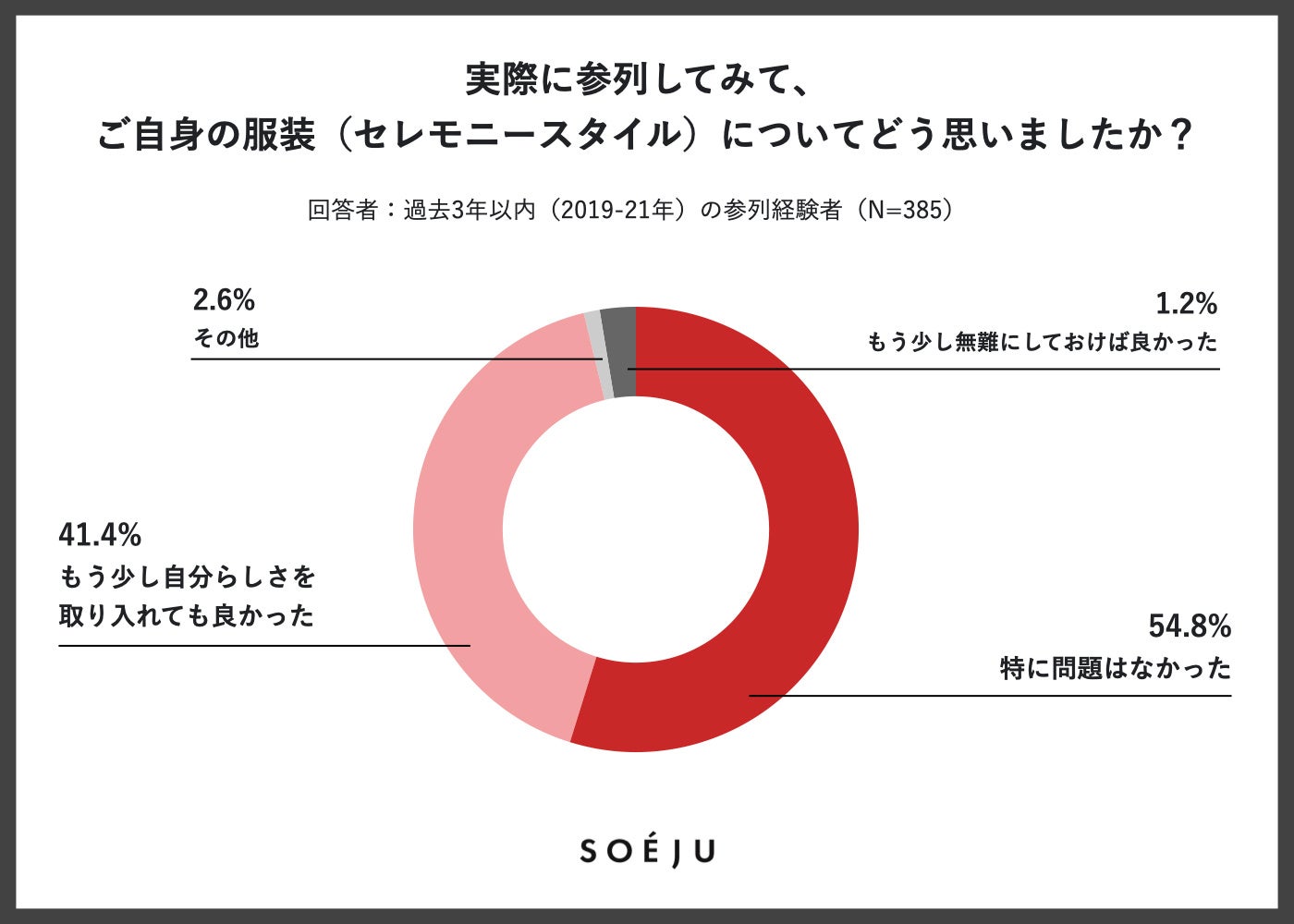 過去参列経験者には「実際に参列してみて、ご自身の服装(セレモニースタイル)についてどう思ったか」の質問に対しては、「もう少し無難にしておけばよかった」は1.2%、「もう少し自分らしさを取り入れてもよかった」は41.4%との回答が得られました。