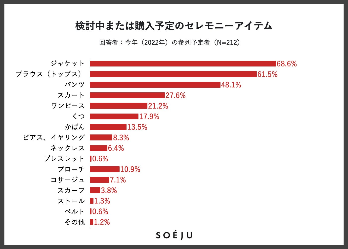 今年参列予定者に「検討中・購入予定のセレモニーアイテム」について伺ったところ、6割以上が「ジャケット」「ブラウス(トップス)」の購入を検討していることがわかりました。続いて「パンツ」が48.1%を占め、以前当社にて実施した調査同様「パンツ派」が多い様子が伺えました。
