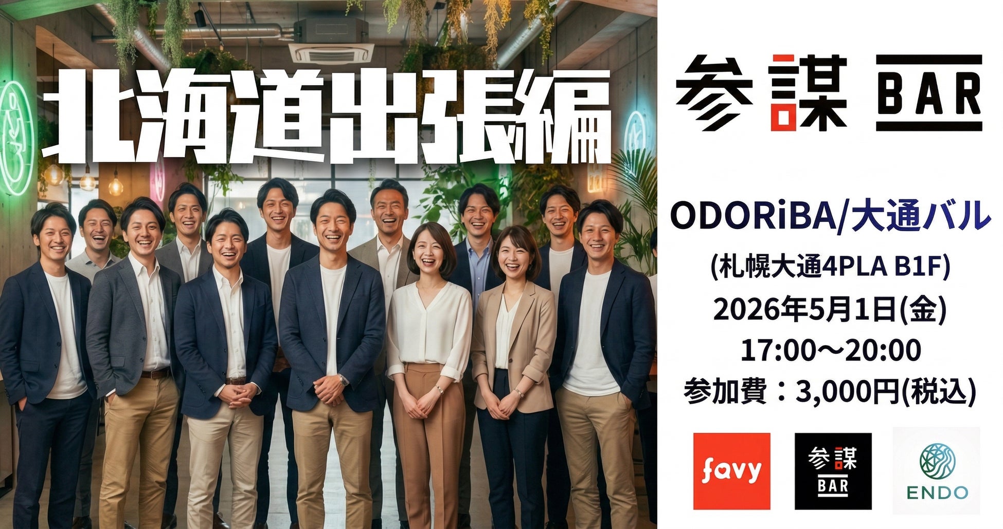 経営者コミュニティ「参謀」を運営する株式会社経営参謀(本社:東京都新宿区、代表取締役:新谷 健司)は、地方創生プロジェクトチーム「縁道(ENDO)」との共同企画として、2026年5月1日(金)に北海道札幌市内にある4PLAの地下1階ODORiBA/大通バル内「オドリバ席」にて、出張「参謀BAR」 in 北海道札幌【「縁道」コラボイベント】を開催します。首都圏で経営者やビジネスパーソンが集うコミュニティBAR「参謀BAR」が、北海道進出を目指す企業を引き連れて初上陸。正社員・複業・副業・業務委託など多様な関わり方を通じて、企業と個人が「酒場(BAR)」ならではのフラットな距離感で本音で語り合える場を提供します。