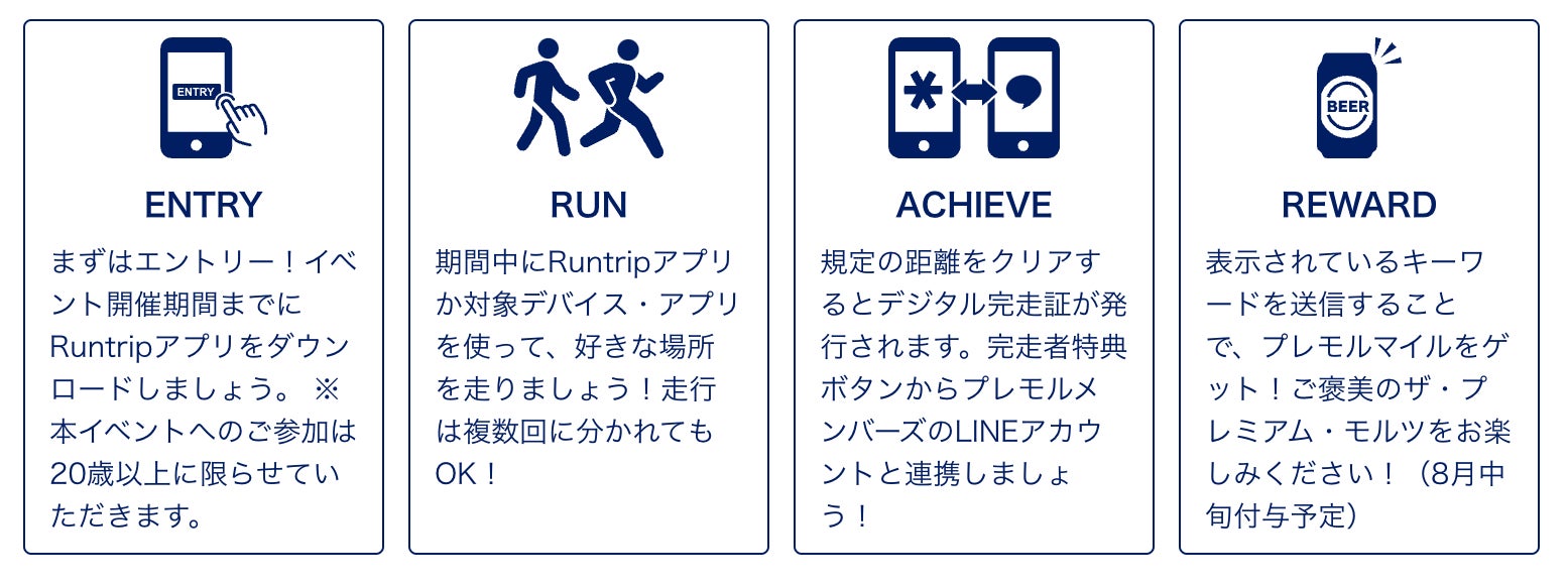当社の「Runtripアプリ」で記録を計測し、実施期間中に10kmを完⾛された⽅には、 「ザ・プレミアム・モルツ」ブランドのLINE公式アカウント「プレモルメンバーズ」にて、「ザ・プレミアム・モルツ」または「同 〈ジャパニーズエール〉⾹るエール 」1⽸(350ml)と引き換え可能なプレモルマイル(250プレモルマイル)をプレゼントします。( 詳細はエントリー特設サイト をご確認ください。)