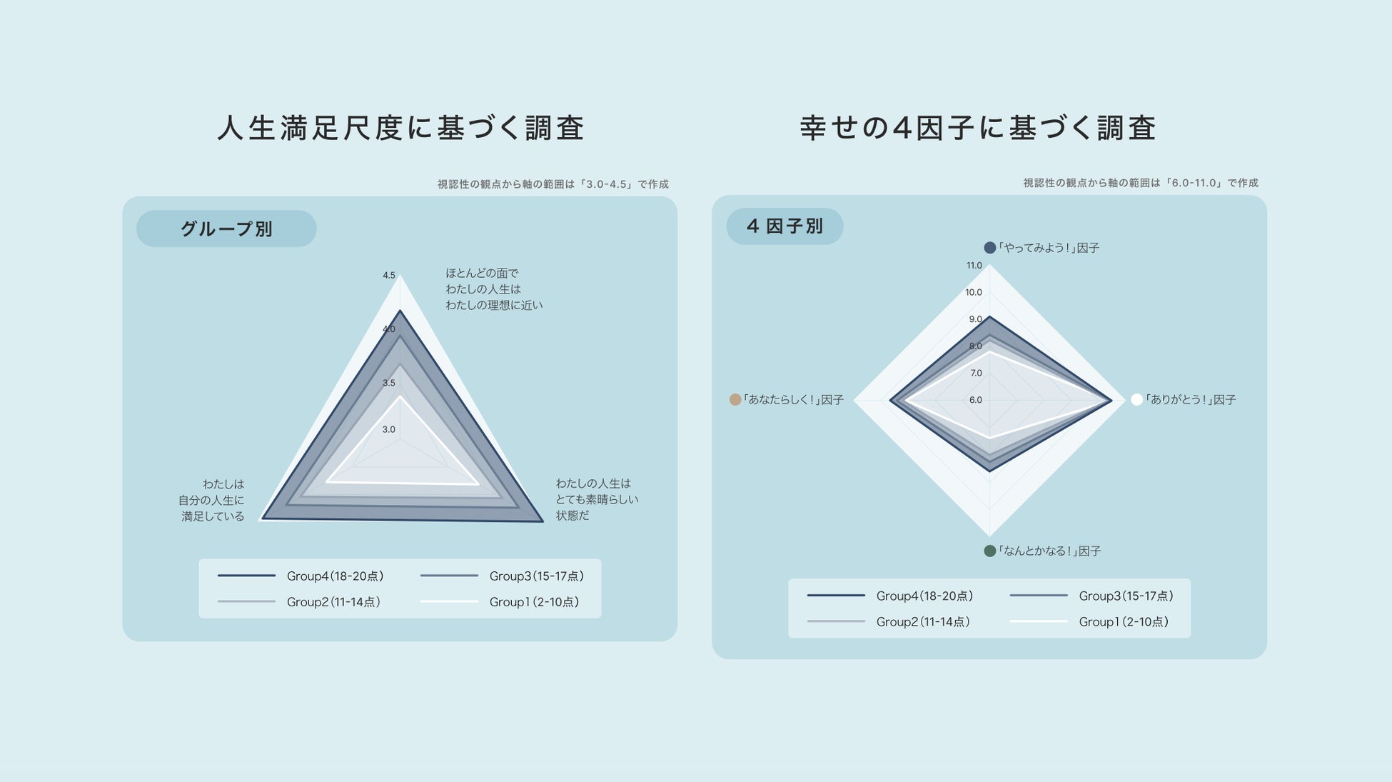 パーソナルビジョンが「ある」と判別されたグループを、「ビジョン実現に傾ける情熱・熱量の程度」「ビジョン実現に向けて実際に使っている時間」という2つの設問のスコアの合計によって、さらに4つのグループ(Group1-4)に区分。その結果、スコアの高い順(Group4→1)で、幸福度も高くなっていることがわかった。