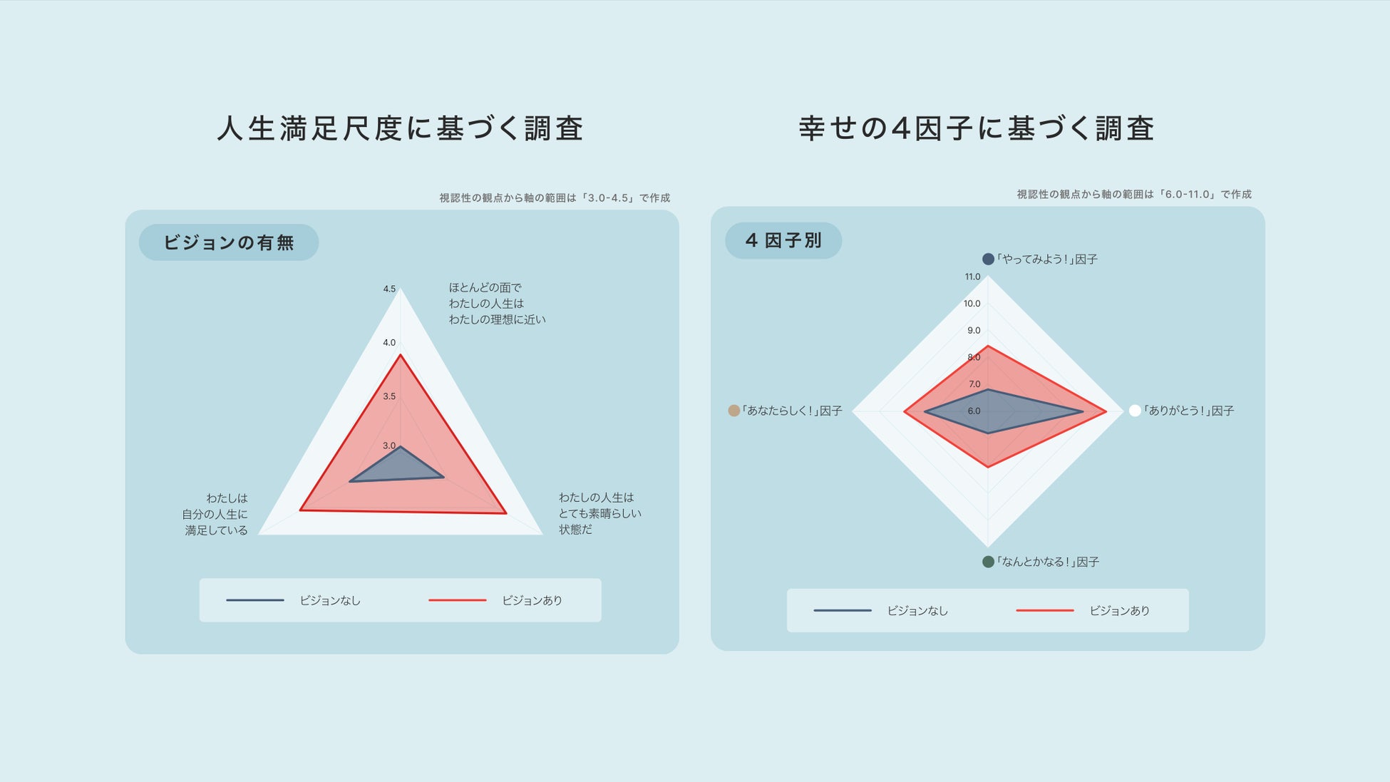 スクリーニング調査にてパーソナルビジョンの有無を判別後、ある人とない人、それぞれに対し、エド・ディーナー博士が考案した「人生満足尺度(Satisfaction With Life Scale)」に基づく調査と、前野隆司教授が考案した「幸せの4因子」に基づく調査を実施した。その結果、いずれの調査においても、パーソナルビジョンがある人のほうが、ない人と比べて幸福度が高いことがわかった。