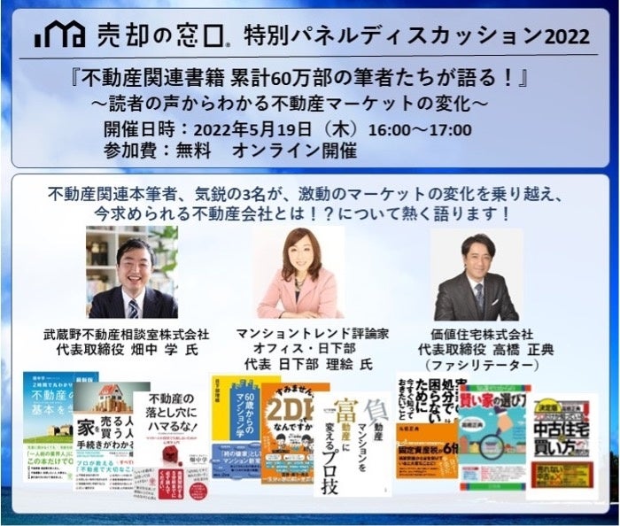 日本唯一の不動産売却全国ネットワーク「売却の窓口®︎」( https://www.baikyaku-mado.com/ 運営会社:価値住宅株式会社 本社:東京都渋谷区、代表取締役:高橋 正典)は、2022年総会の開催にあたり、特別公演として『不動産関連書籍 累計60万部の筆者たちが語る!』〜読者の声からわかる不動産マーケットの変化〜を開催します。