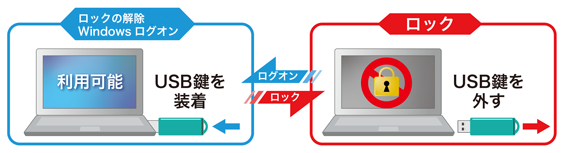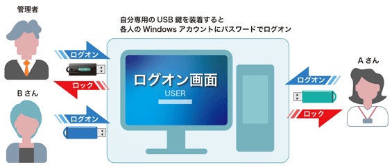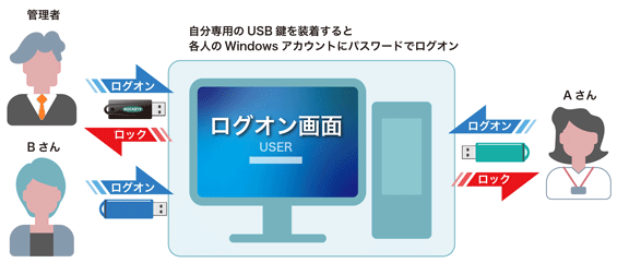 『LB パソコンロック5 Pro』の鍵はWindowsのユーザーと連携させることができるため、USB鍵の装着だけでWindowにログオンすることができます。