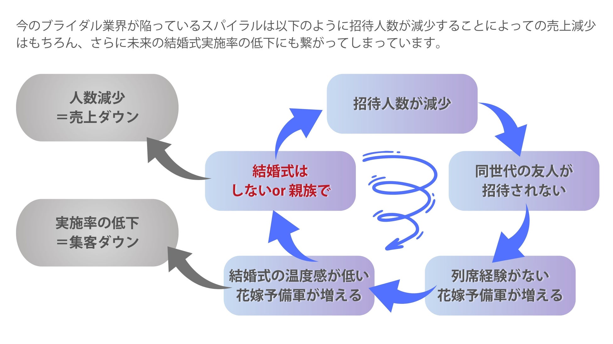 実際、上記のグラフにあるように結婚式の実施率と招待人数には相関関係があります。我々はコロナ禍での招待人数の低下が実施率の低下に一定の因果関係があるのではないかと考えています。ブライダルマーケットでは以下のような悪循環が生まれてしまっているのではないでしょうか。