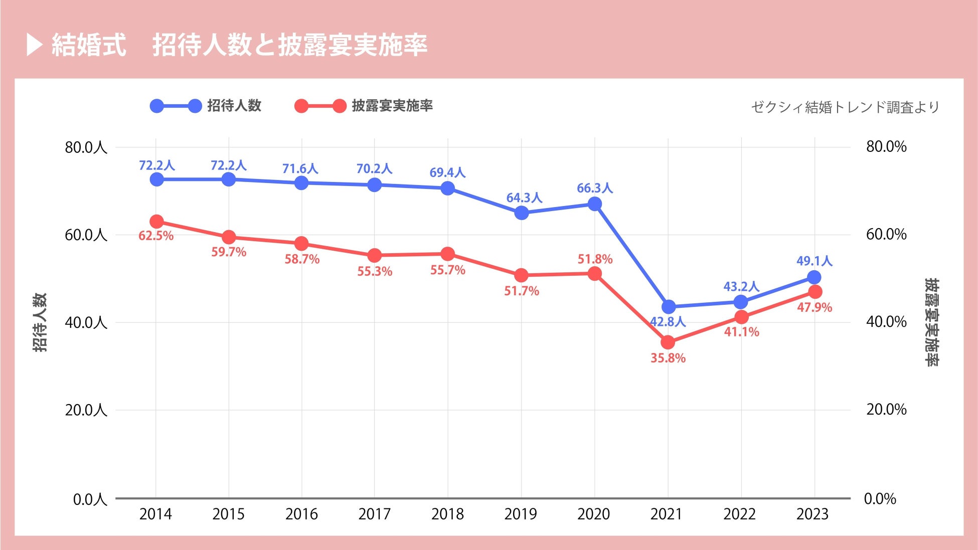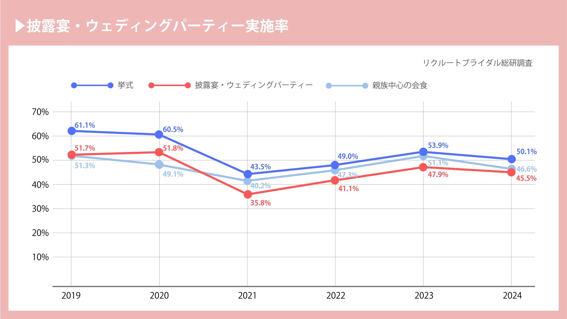 リクルートブライダル総研の調査結果によると、2024年の披露宴・ウェディングパーティーの実施率は約45%と過半数をきっています。