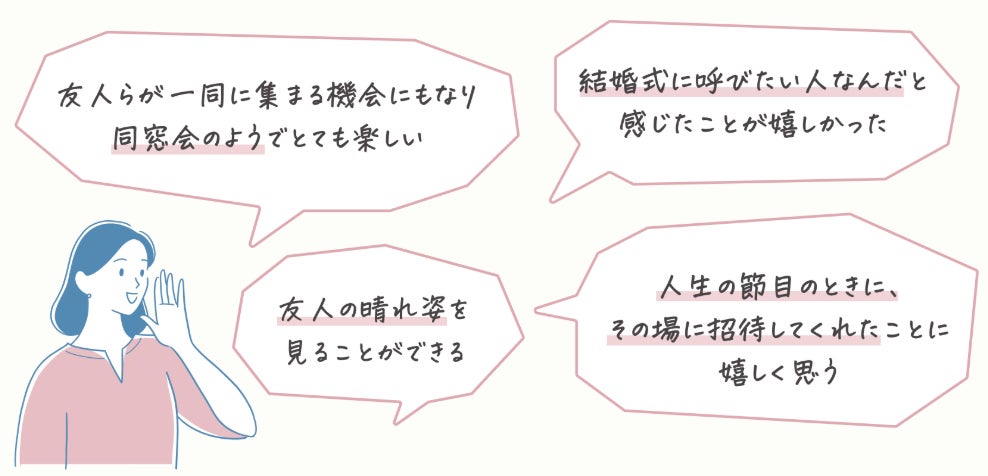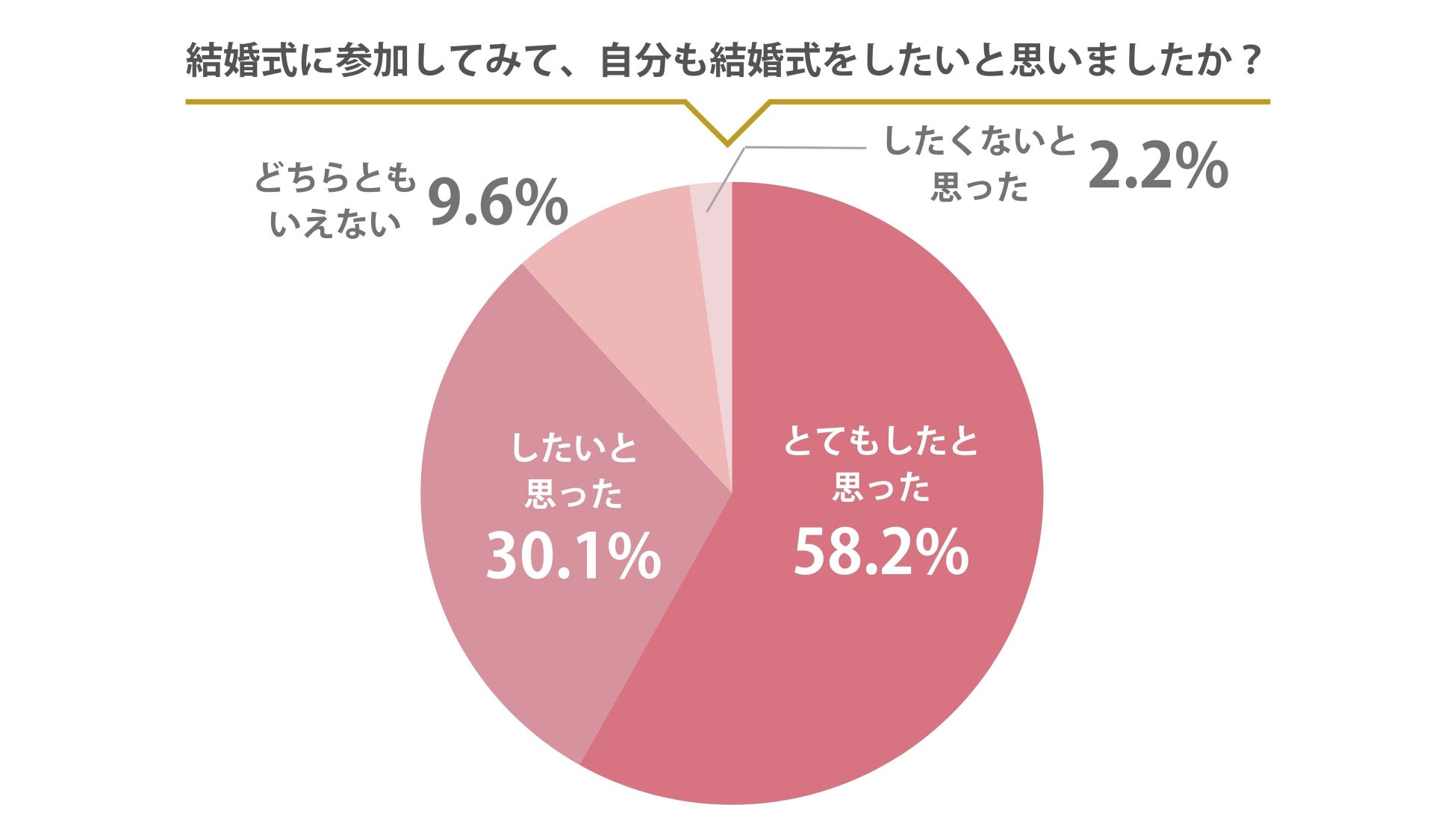 一方で今回、実際に結婚式に参列したゲストへの調査を行った結果「結婚したい意欲が高まった」、「結婚式をしたいと思った」、「結婚式に招待してくれて嬉しかった」という声が圧倒的に多い結果になっています。