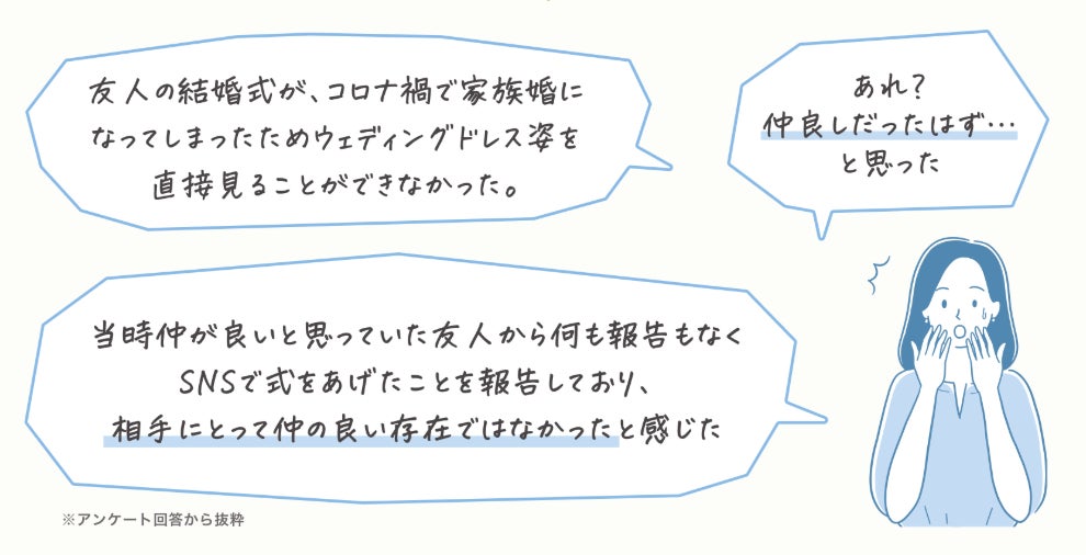 一方で、コロナ禍による結婚式の参列機会の減少により、友達を結婚式に招待するイメージがつきにくいと感じる人が増えているようです。