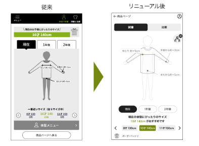 ・重要項目(試着・比較の切り替え、成長予測機能、レコメンドサイズ、サイズ変更)と補助項目(体型編集機能など)の重要度に則って配置を整理