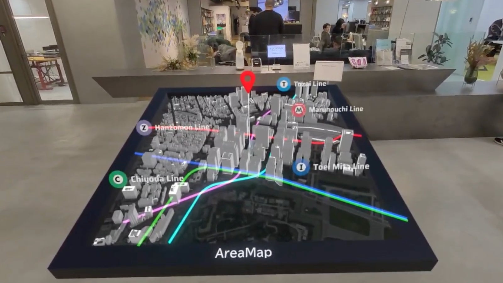 まず、〈現実情報と従来では可視化できなかった情報を融合・相互補完する〉ことで直感的な理解を促します。視聴デバイスを通して、約20分間かけてオフィス内10スポットから「空間・建物全体の鳥瞰や構造内部」「設計思想や使用素材の持つ背景」「パーパスを反映したワークシーンの体現過程や組織の価値観」などを可視化します。
