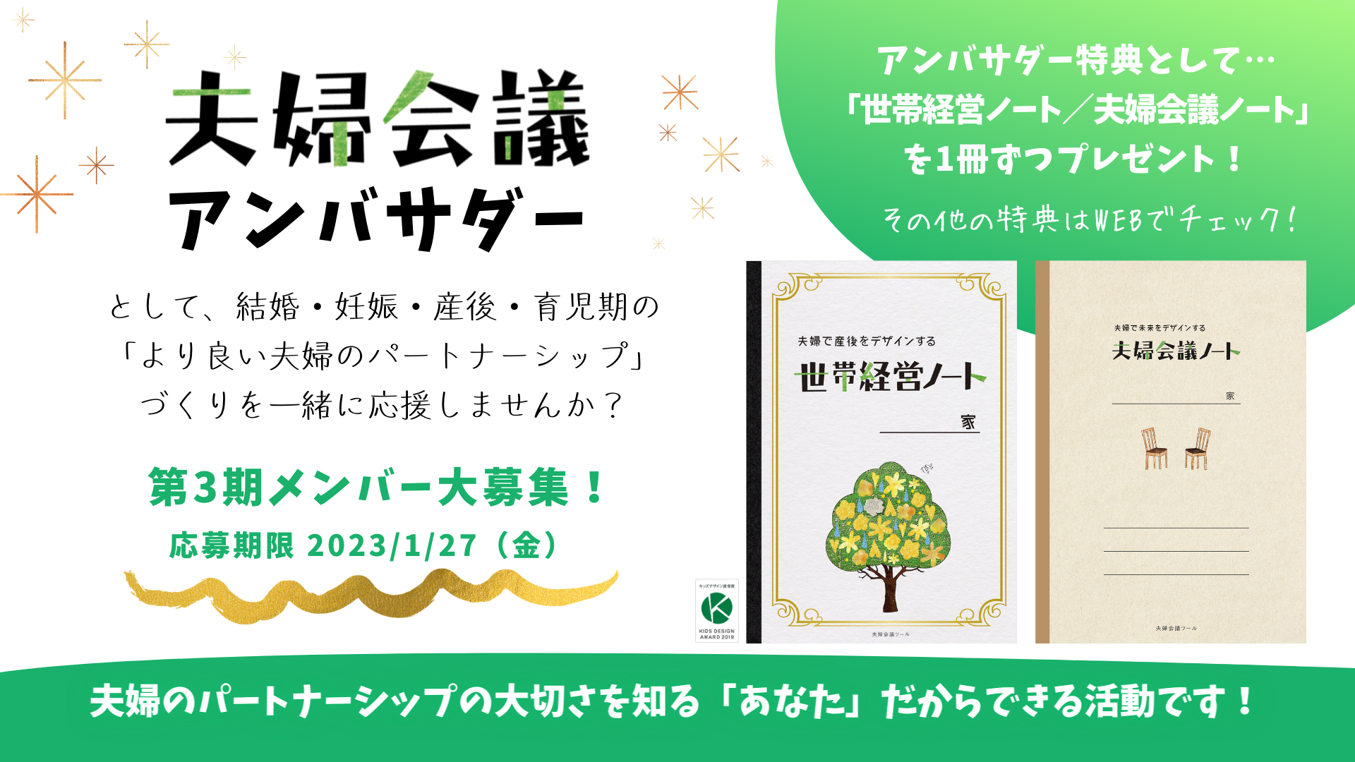 キッズデザイン賞受賞の夫婦会議ツール「世帯経営ノート」のプレゼントなど、特典いっぱいな『夫婦会議アンバサダー®』の活動の詳細を以下でご紹介致します。