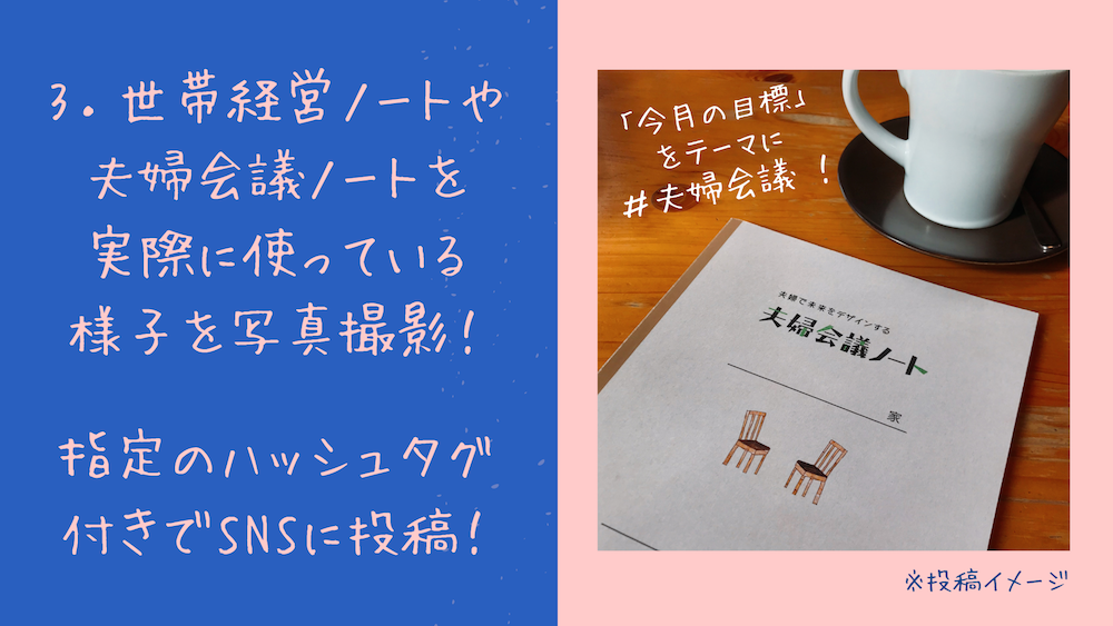 3)世帯経営ノートや夫婦会議ノートを使っている様子を撮影!指定のハッシュタグ付きでSNSに投稿!