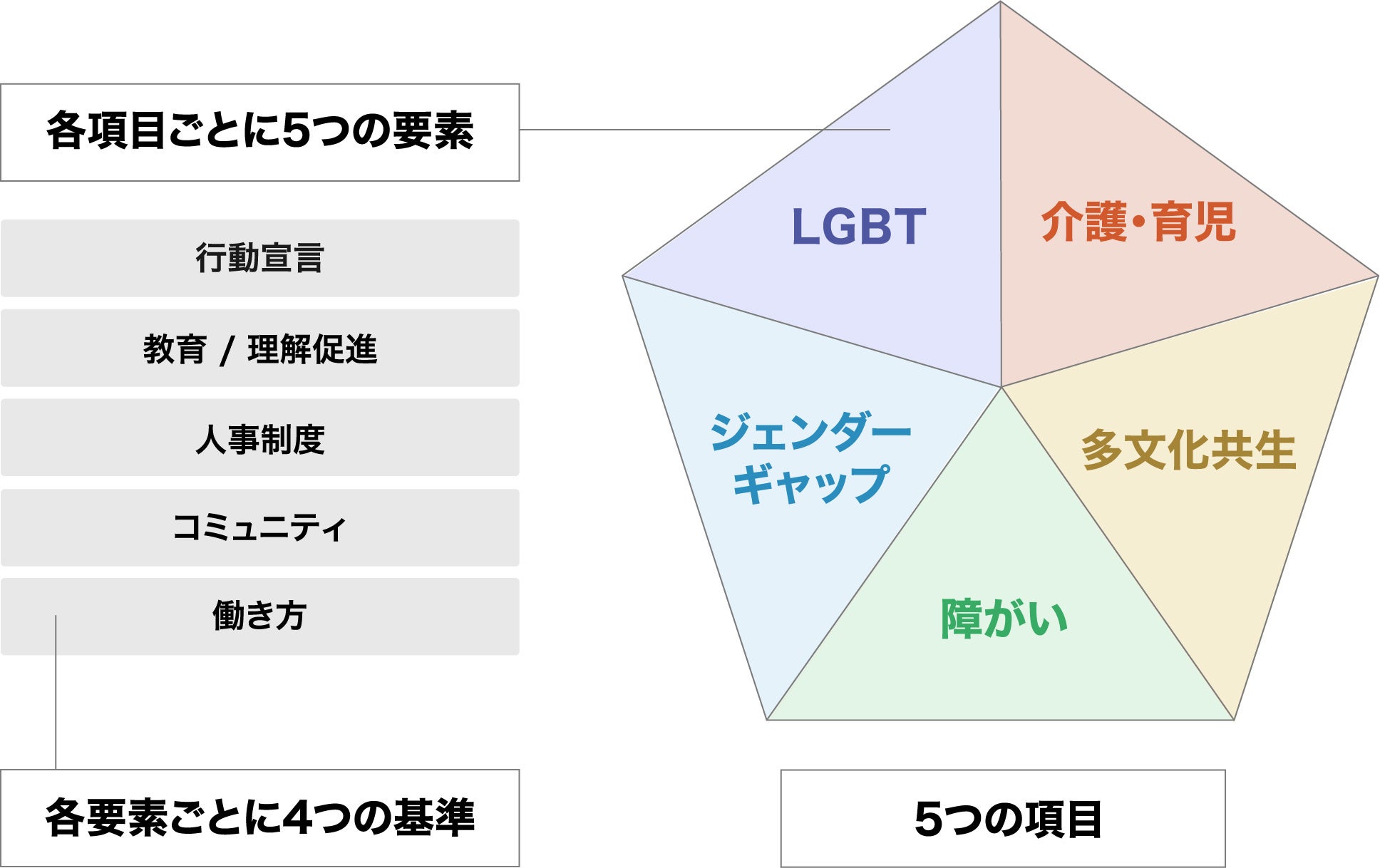 【LGBT】【ジェンダーギャップ】【障がい】【多文化共生】【介護・育児】の5つの観点で構成された100項目です。D&Iの重要性・理念の理解や社内啓発だけでなく、具体的な施策も盛り込んでいます。