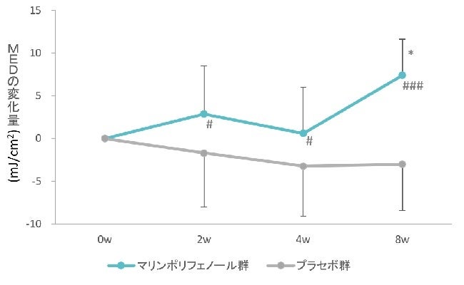 MEDはマリンポリフェノール群では摂取前に比して摂取8週間後に有意な差が認められた。また摂取2週間後、4週間後、8週間後においてマリンポリフェノール群とプラセボ群の間で差が認められた(図1)