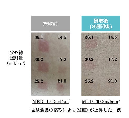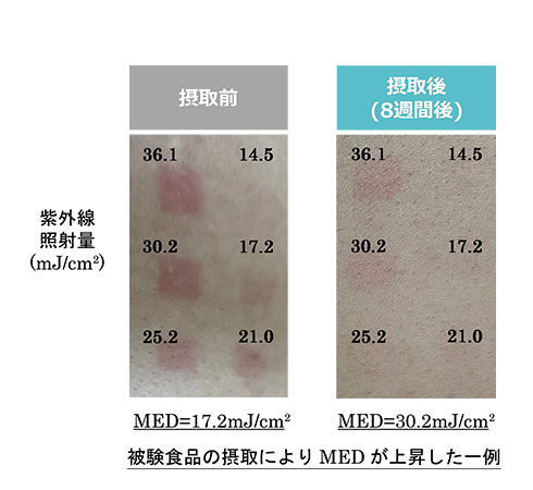 試験責任医師が、健常な日本人成人女性42名をマリンポリフェノール®含有混合素材を摂取する群(マリンポリフェノール群)あるいはマリンポリフェノール®含有混合素材を含まない食品(プラセボ)を摂取する群(プラセボ群)に無作為に分けた。両群とも各食品を8週間連続摂取し、紫外線を背部皮膚に照射した24時間後の最小紅斑量(Minimal Erythema Dose、以下MED)を測定した。本試験は二重盲検法で実施した。結果は以下の通りである。