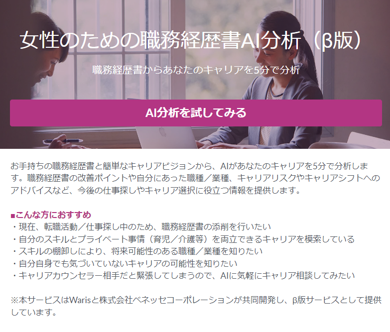 「女性のための職務経歴書AI分析(β版)」の特徴