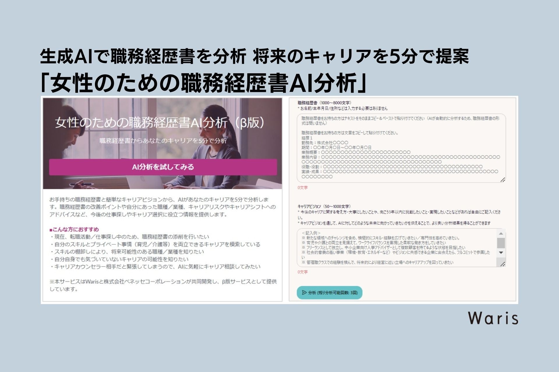 女性の多様な働き方への支援を通じて、すべての人の自分らしい人生を応援する人材サービス企業株式会社Waris(所在地:東京都千代田区、代表取締役:米倉史夏、田中美和、河京子、以下Waris)は、「女性のための職務経歴書AI分析(β版)」をWarisの親会社であるベネッセグループと共同で開発いたしました。