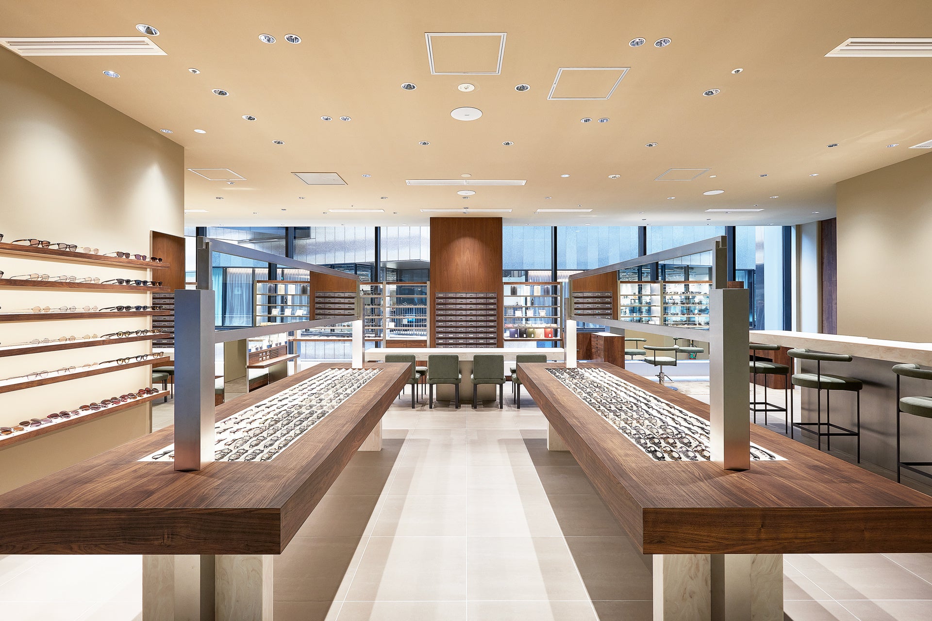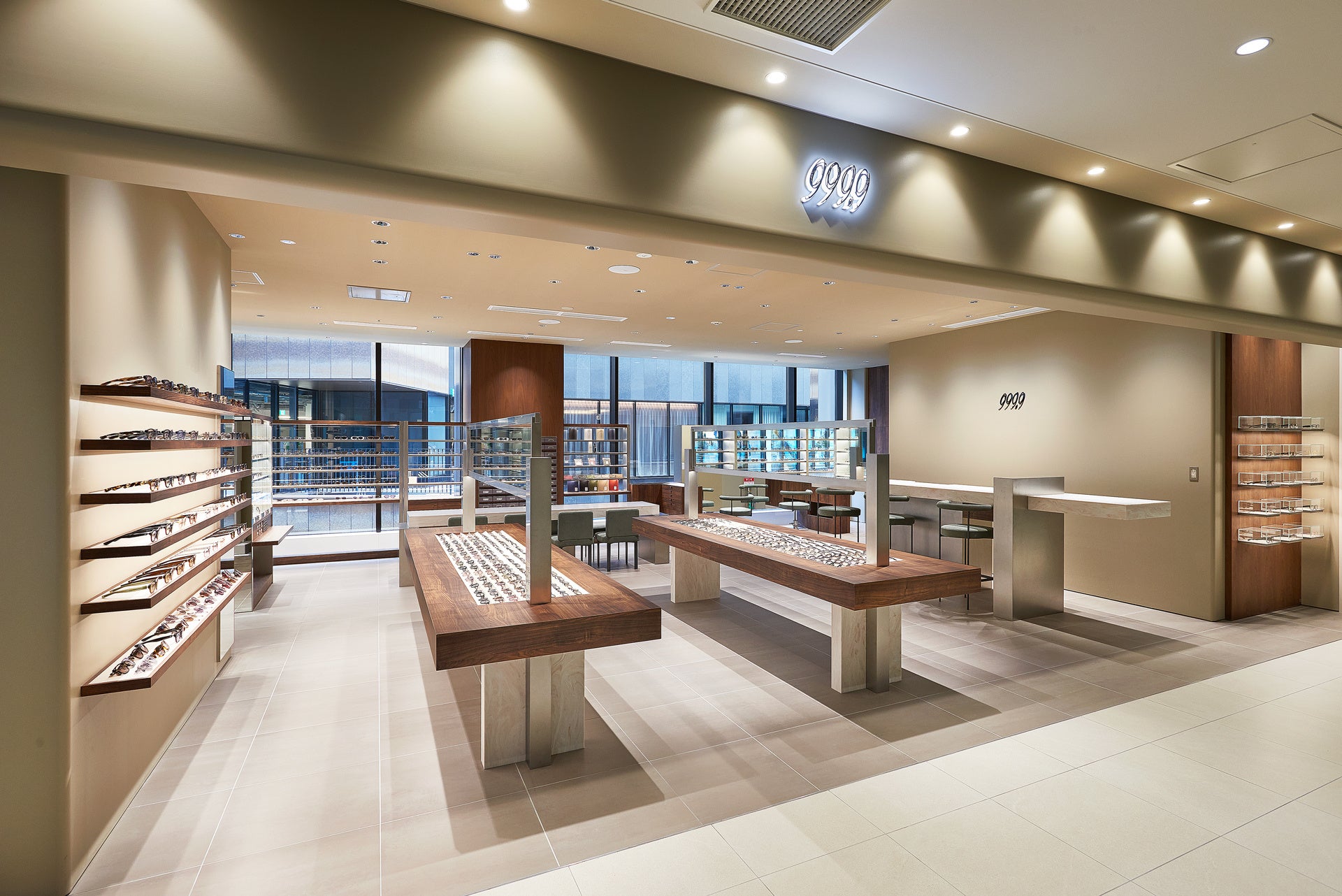 999.9の眼鏡フレームをはじめ、999.9 feelsunのサングラス、FN / FOUR NINESのアイウェアを含めたフルラインナップの商品展開を行います。さらに、フィッティングスペースやメンテナンス専用カウンターなども完備し、フォーナインズが目指す理想の眼鏡環境を体現した空間です。