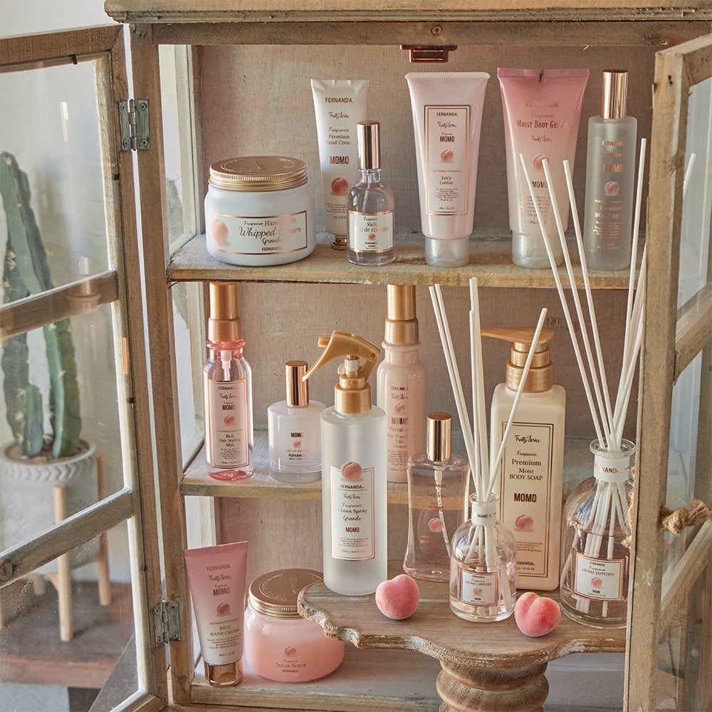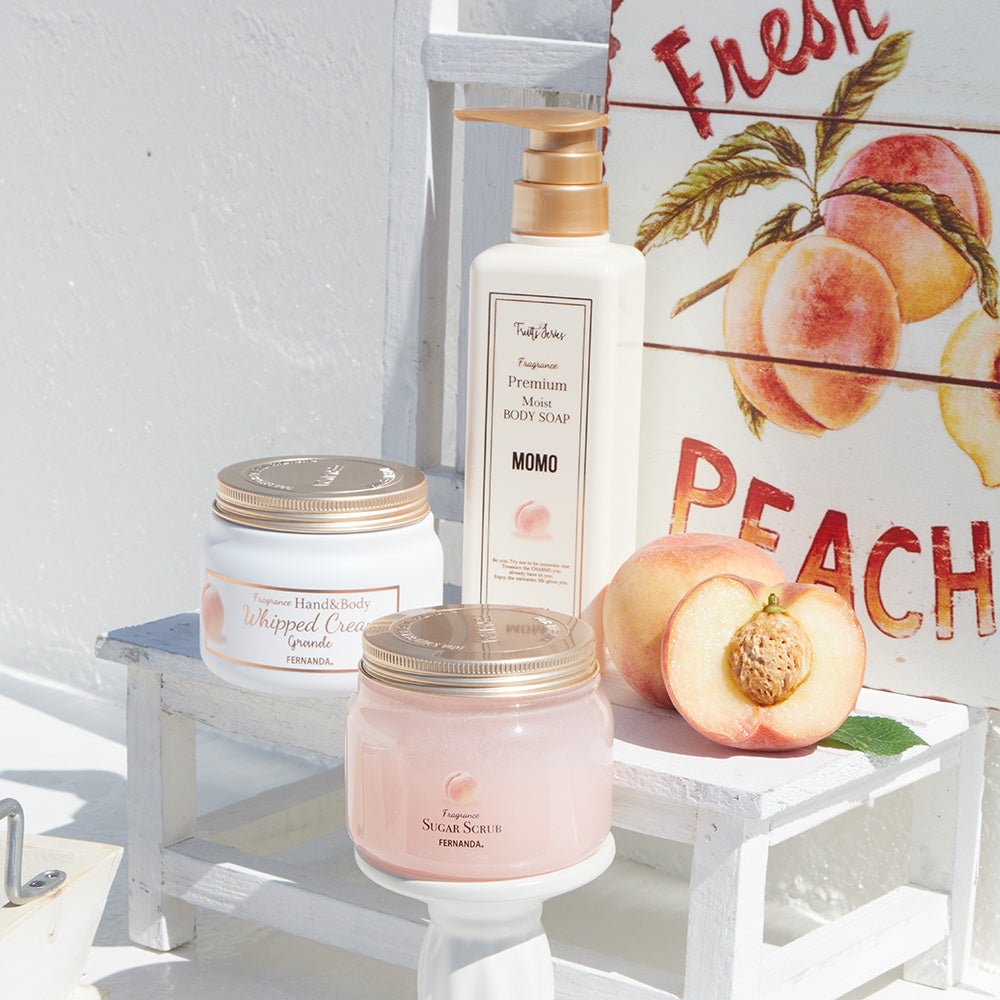 桃農園の愛情をたっぷり受けて育った桃の甘くジューシーな果実感。昨年、即完売アイテムが続出した大人気フェルナンダ「モモコレクション」が今年もリリース。