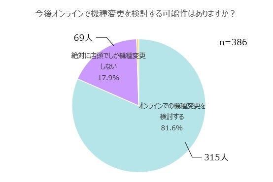 店頭で機種変更した386名の方に、もし機種代金や手数料が安くなるなら「今後オンラインでの機種変更を検討するか?」と質問した所、315名の方、つまり約8割が検討したいと回答しています。