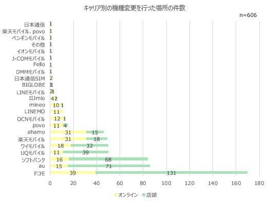 ただ、楽天モバイルに限っては約6割が、オンラインで機種変更したと回答しています。楽天モバイルは他のキャリアに比べて店舗数が少ないのが現状です。気軽に立ち寄れる店舗がないためにオンラインで手続きしているとも考えられます。