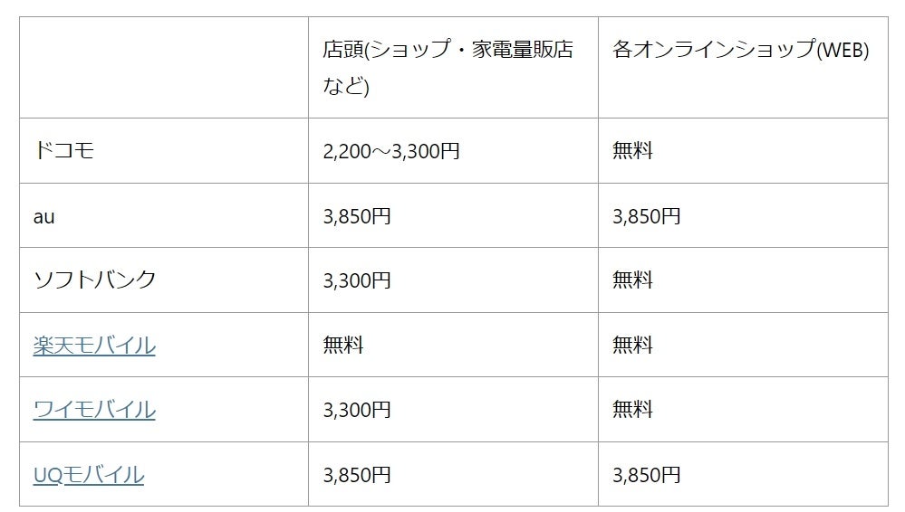 ちなみに機種変更時の事務手数料に関しては以下の通りです。(税込み価格)