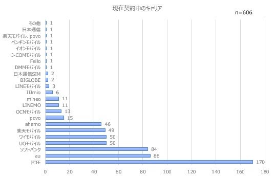 続いて、楽天モバイルや大手キャリアの格安プランを展開するワイモバイル、UQモバイル、ahamoで195名、全体の約3割を占めています。