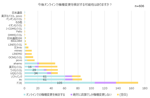 キャリア別にみると、オンラインで機種変更を検討すると回答した方は以下のようになりました。