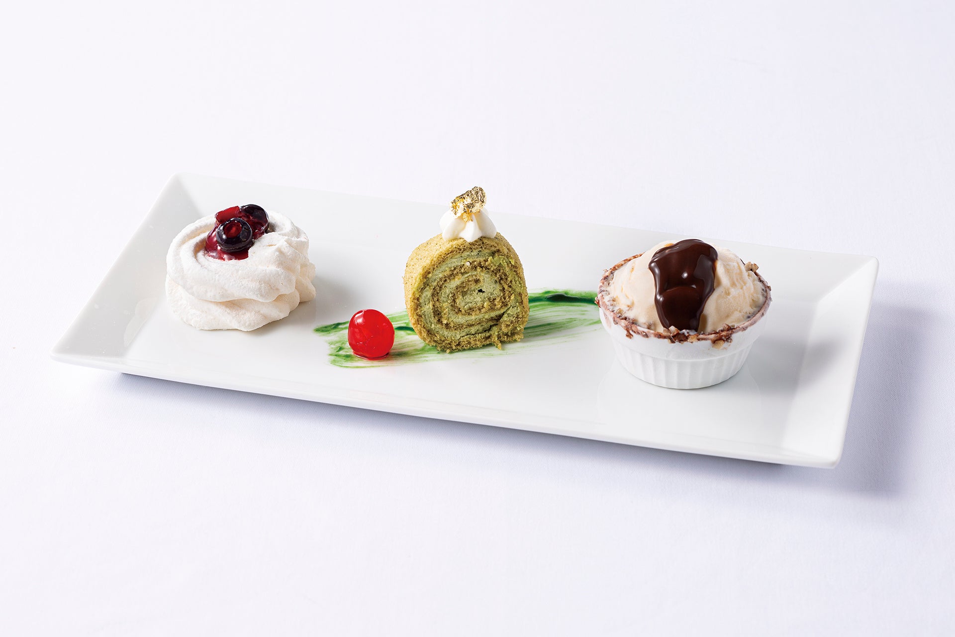 [ミックスベリーのパブロヴァ、宇治抹茶のロールケーキ、バニラアイスクリーム 温かいチョコレートソースで]