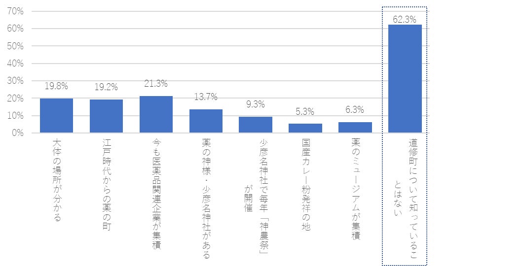 62.3%の方が「道修町について知っていることはない」と回答し、3年連続で過去最高を更新しました。その他、道修町の立地や道修町を「くすりの町」と認識する割合も、2016年の調査開始以来最も低い水準となりました。