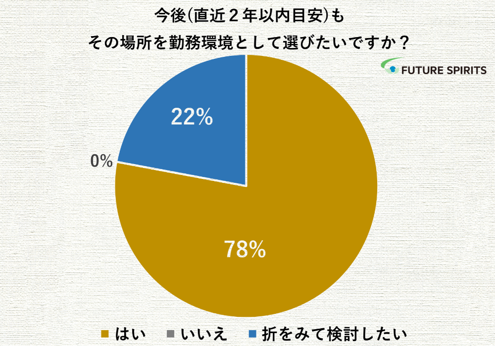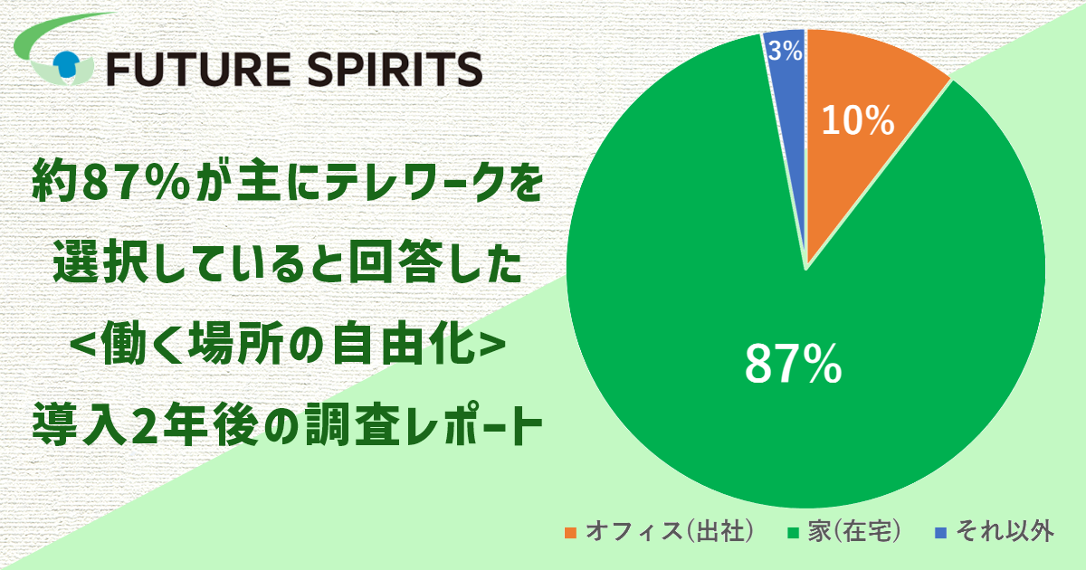 株式会社フューチャースピリッツとフューチャースピリッツグループ各社(株式会社フューチャーヒット、株式会社フューチャースピリッツ アジア、Future Spirits Malaysia Sdn. Bhd. 、Future Spirits Thailand Co., Ltd.) (以下、フューチャースピリッツ)は、2020年7月1日に全社導入し、2年が経過した、在宅・出社を自由に選択できる勤務形態<働く場所の自由化>制度について、社内アンケートを実施しました。約87%が主に在宅勤務を選択しており、在宅選択者のうち約85%が今後も主に在宅勤務を継続したいと回答があり、“自由に選択できている”社員の満足度は高いことがわかりました。