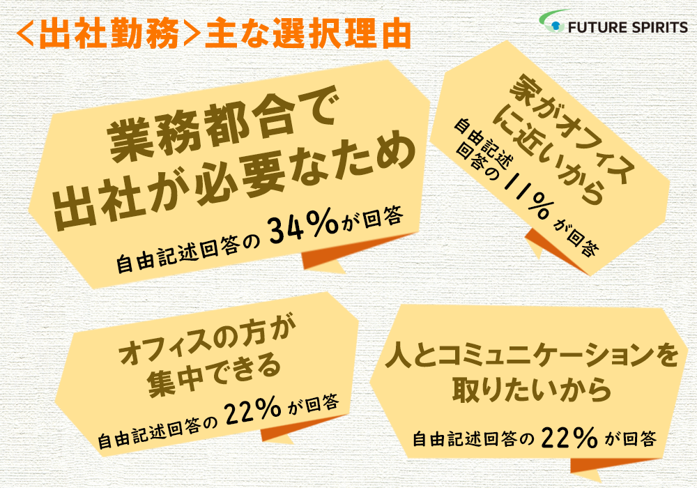 「出社選択者」に限ると34%は自由選択ではなく、業務都合を優先して出社を選択してオフィスで勤務していることがわかりました。