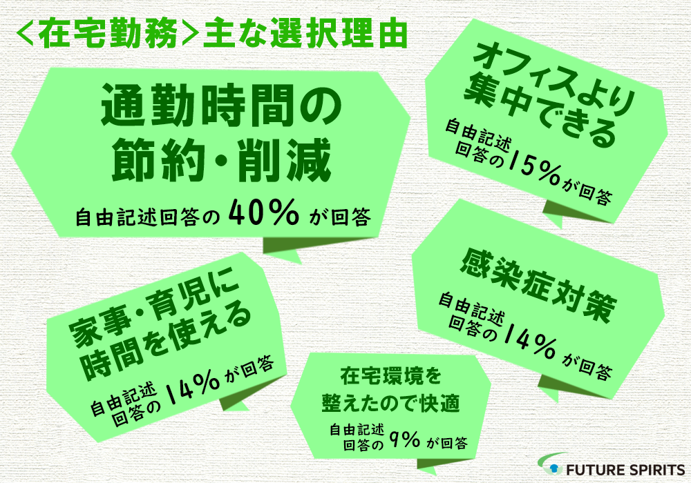 それ以外では、「外出しないとお金を使わないで済む」や「インドア派だから当然在宅」、「時代に合わせた業務スタイルに挑戦したい」等という回答がありました。