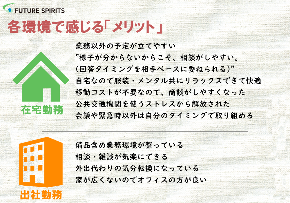 - 個人の快適さに貢献する「在宅勤務」、業務の快適さに貢献する「出社勤務」